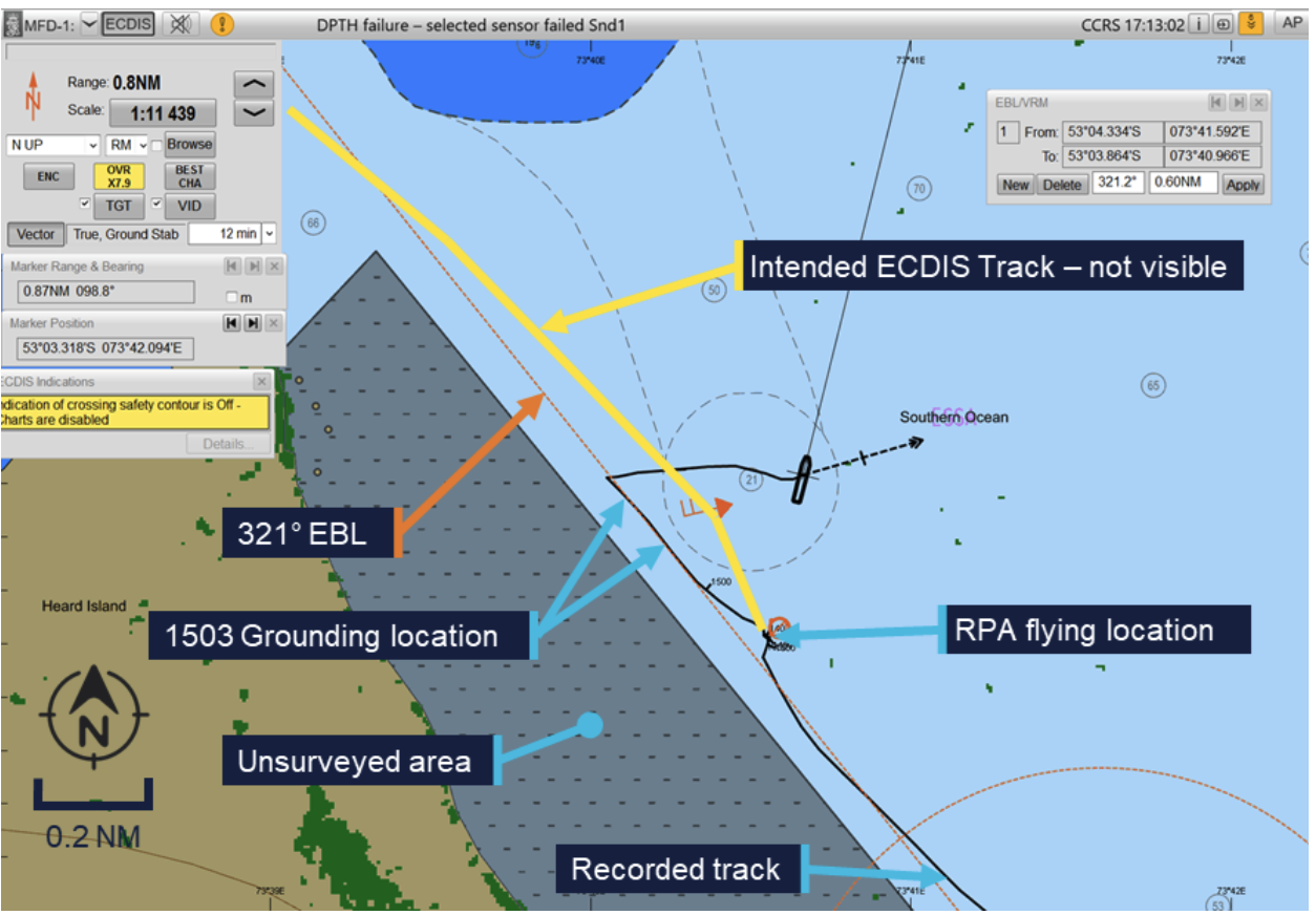“The grounding occurred while Nuyina, the Australian Antarctic Division’s research and supply vessel, was conducting drone survey operations over the shore of Heard Island, close to an area of uncharted seafloor,” ATSB Chief Commissioner Angus Mitchell said.
