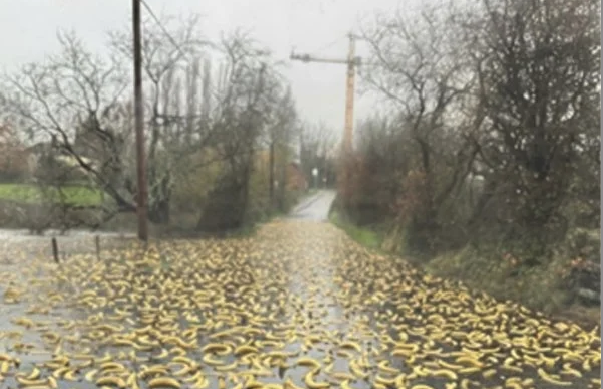 Due to the stormy and windy weather in the Selsey area, bananas have been swept off the beach into coastal roads, making for slippery driving conditions in some areas.