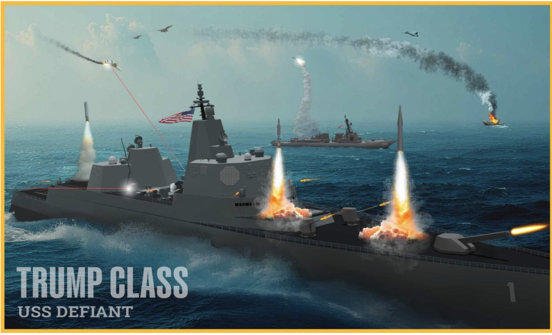 The first vessel, USS Defiant (BBG-1), would inaugurate what the navy is calling the Trump class battleship, envisioned as a ship that would be capable of distributing more firepower across naval formations than any existing class of warship.