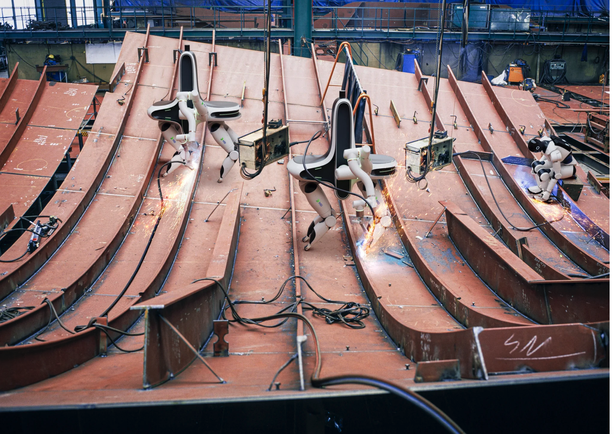Humanoid robots have the advantage of being able to interact with an environment designed for humans, but as a platform, they have technical challenges to overcome. Any mobile device in a shipyard has to navigate changing site layouts, walk on uneven surfaces and survive dust and weather conditions. Alternatively, small single-purpose robots that de-skill the task of welding - but leave the human in the yard - have been tried out at DSME and HD Hyundai, to good effect. A co-bot welding-arm device employs a human worker to carry, place and set up the arm; the arm does the skilled welding while the worker performs another task.