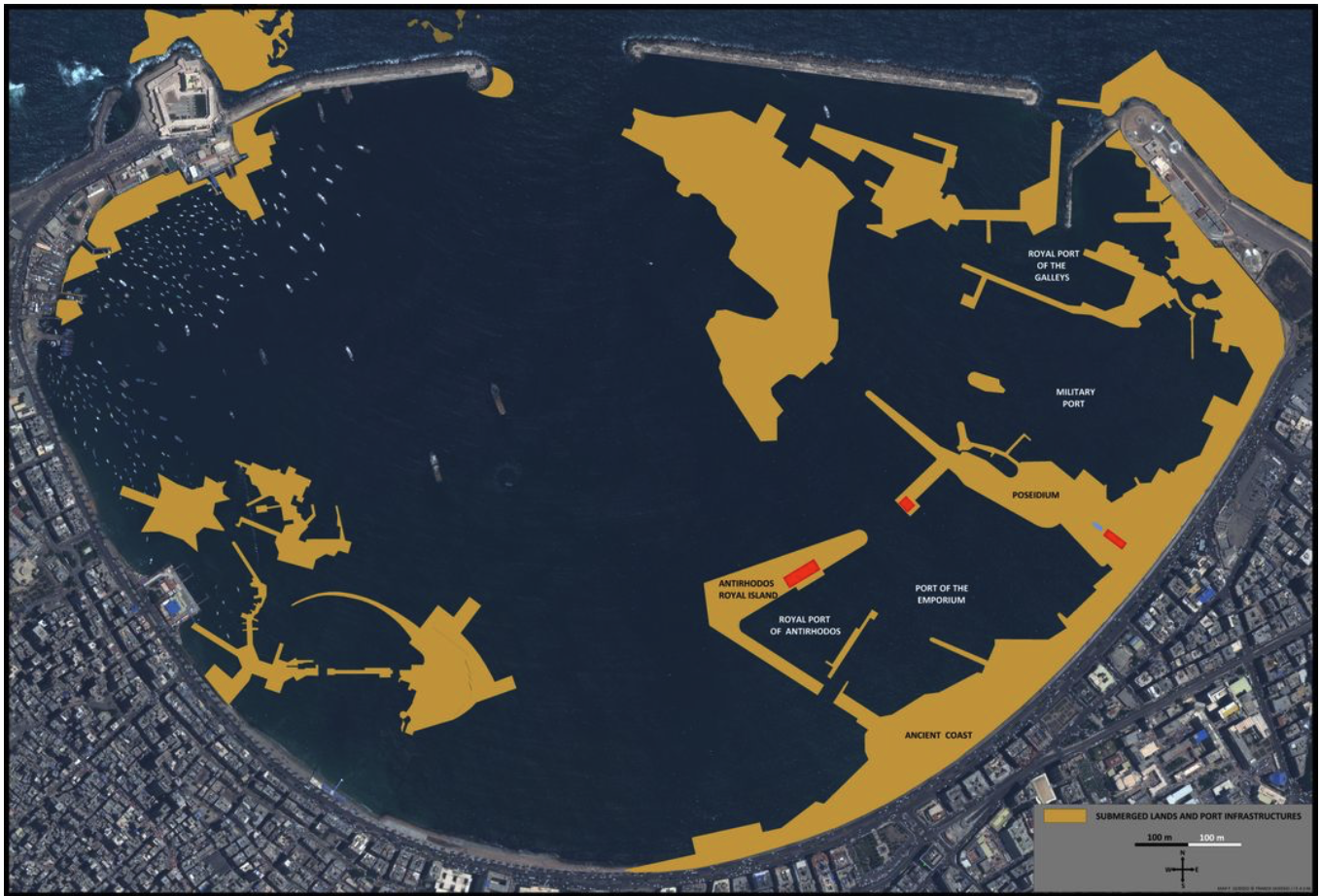 A map of the ancient remains of the Portus Magnus, with yellow indicating sunken and destroyed structures and coastline Christoph Gerigk © Franck Goddio / Hilti Foundation