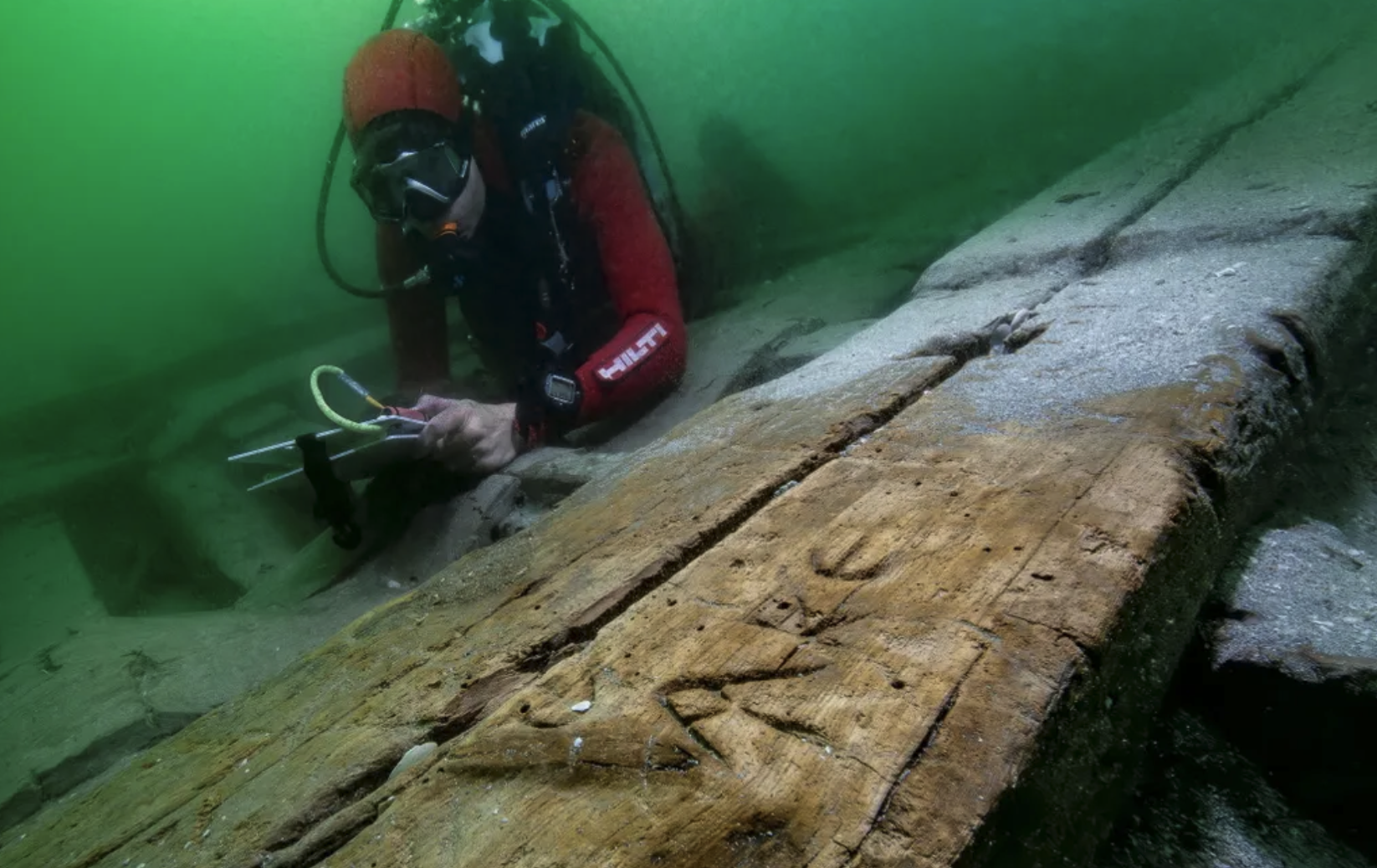 Researchers think the Greek graffiti found on the boat dates to the first century C.E. Christoph Gerigk Franck Goddio /Hiliti Foundation