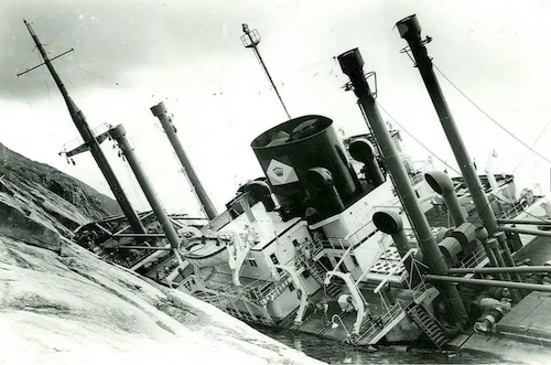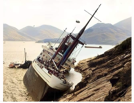 MS Tjibantjet (Royal Interocean Lines), a passenger-cargo liner, 8,300 tons, built in 1952 in Sunderland, England was driven from her moorings and ran aground on rocks near Devil's Peak in Junk Bay, Hong Kong, during Typhoon Gloria on 22–23 September 1957.