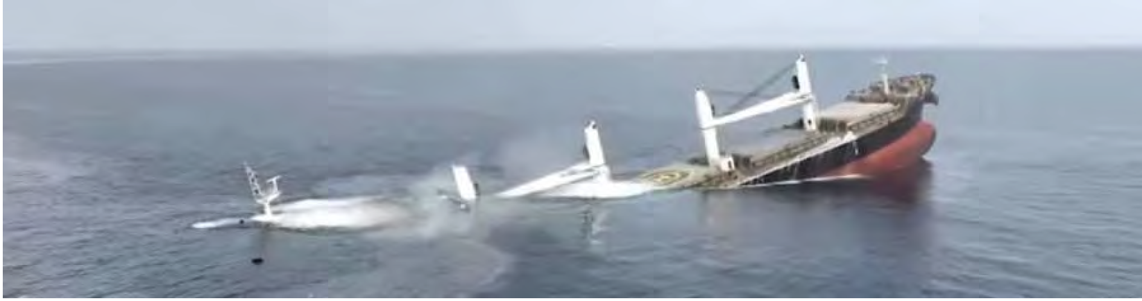 A vessel said to be the Greek-operated, Liberia-flagged ETERNITY C sinks in footage released by Yemen's Houthis, in the Red Sea, in this screen grab taken from a handout video released on Wednesday. (Houthi Media Centre/Handout via Reuters)