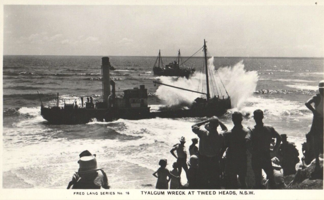 The 544-ton steel steamer Tyalgum was on a voyage from Sydney to Tweed Heads when it ran ashore on Duranbah Beach under tow on 25 August 1939. With over 2 metres of water rising in the hold, the seventeen crew were taken off with the aid of lines. Several salvage attempts failed, the wreck later being sold at auction and the machinery and boiler recovered.